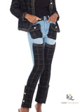 Washed denim paired with plaid mohair knit and finished with tinsel and pearls strikes the perfect balance of rugged and refined. Pant Inseam 31"