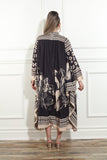 A show-stopping kaftan dress with artistic tribal print motifs in striking black and beige. Designed for flow and drama, it offers effortless sophistication for any occasion.