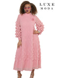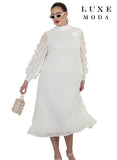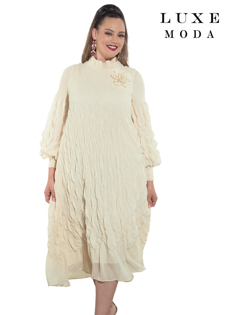 Refresh your daytime wardrobe with Style LM-481, an effortless and modern dress from the Luxe Moda collection that balances unique texture with a polished silhouette. This versatile piece is accentuated by a high smocked neckline and a chic "petal" textured body, creating a refined yet relaxed look suitable for a variety of social settings. The design is elevated by voluminous sheer sleeves and a delicate floral applique at the shoulder, allowing you to transition seamlessly from a morning brunch to an afternoon social gathering. Available in a curated palette of beige, black, light blue, pink, and white, this dress simplifies sophisticated dressing for the contemporary woman.