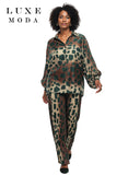Relaxed button-front blouse paired with wide-leg pleated pants in an abstract green and brown print. A bold yet easy-to-wear set that blends comfort with standout style.