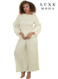 Synchronize your seasonal style with the ethereal allure of Style LM-509, a cohesive two-piece set that proposes a graceful pairing of a pleated peplum top and matching wide-leg trousers. This captivating ensemble delivers a plissé texture throughout the bodice and tiered bell sleeves, creating an impactful silhouette that remains subtle and breezy for all-day wear. Manifest a sleek and composed presence in a monochromatic palette of beige, black, or blush, allowing you to uphold a poised and uncomplicated standard for every daytime social.