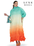 Capture a vibrant and sculptural presence in this flowing maxi dress that balances an artisanal gradient effect with a dynamic pleated texture. The design engages the eye with a luminous ombre transition, cascading from soft pastel tones into deep, concentrated hues at the uniquely pointed hemline. Relaxed sleeves and a structured high neckline provide a composed frame for the voluminous silhouette, allowing you to elevate your daily rotation with unfailing ease. Available in spirited celery-green, romantic pink-plum, or a refreshing mint-orange combination, this piece distinguishes your wardrobe for any contemporary social occasion.