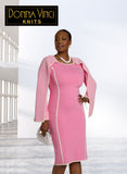 This stunning rose-pink 45" dress made with exclusive knitted yarn is beautifully accented with delicate pearl trims. This piece is perfect for making a romantic statement at any event.