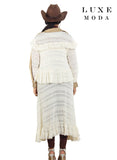 This standout trench redefines chic with contrast textures of crisp khaki and ivory ruffles, complete with a belted waist and Western flair — powerful and playful.