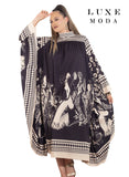 A show-stopping kaftan dress with artistic tribal print motifs in striking black and beige. Designed for flow and drama, it offers effortless sophistication for any occasion.