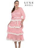 Visualize a cultivated and lengthened aesthetic in this pleated midi dress, which echoes a supple visual rhythm through its dainty, tiered ruffles. The garment accents each layer with a tinted ombre gradient at the edges, creating a weightless effect that outlines a placid and lean profile. A tidy V-neckline and matching sash bespoke the waist with measured precision, allowing you to shift with urbane ease between various social settings. Available in blossom pink, bold red, or mossy olive, this selection sustains a modish and ready presence for the contemporary woman.